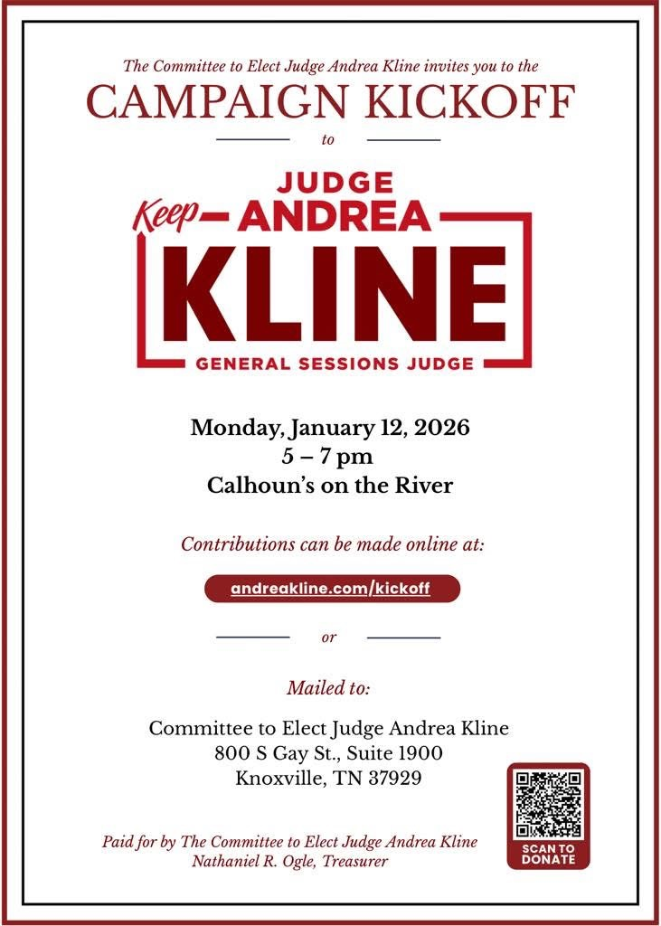 The Committee to Elect Judge Kline is excited to invite our friends, supporters, and community members to the Campaign Kickoff for Judge Andrea Kline, as we officially launch the effort to keep her serving as General Sessions Judge.